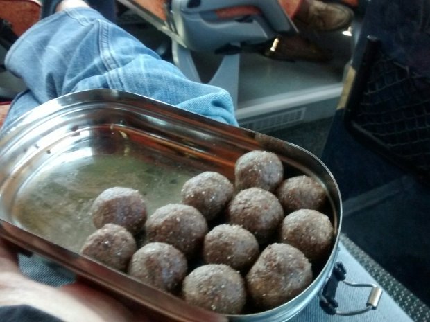 Time for my health-geek packed lunch of veggies in wild herb chutney (in a reused soy joghurt jar) and home-made chocolate superfood laddus!