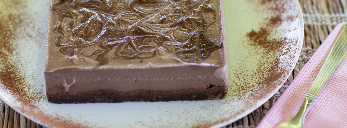 STEP 4: Pour the filling into the prepared crust. Decorate by dropping spoonfuls of ganache over the filling, and using a toothpick to swirl the two together; or decorate with chocolate shavings just before serving. Cover the cake and chill until firm.